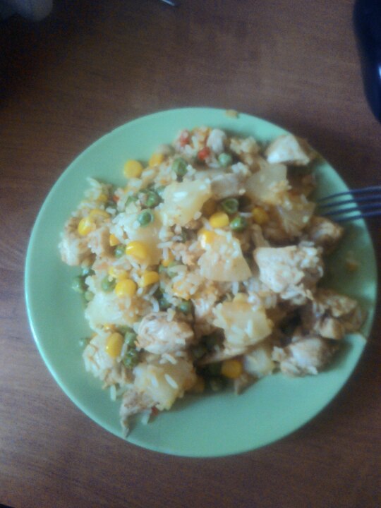 2. Вбухиваем туда же пакет гавайской смеси, добавляем ещё приправы по вкусу, перемешиваем с курём, закрываем крышкой, тушим.