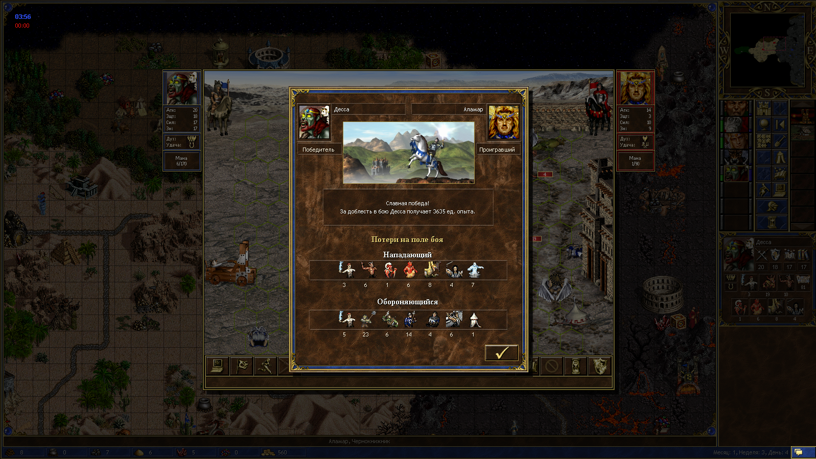 Отдал кастл за 6500, отрестартились, опп сдал свои ресты, со своих последующих рестов получил хорошую сдачу, словил дессу, которая на пару с калхом быстро качнули земели, а так же оба были с разведками, на 112 отбил коробку за тряпками на 25 гр. демона+была нычка у города на демона, вышел на 123 с ~40 демонами, ~20 утками и 8 ангелами, го неприятное из архов, съели всех гигантов, но центр окупился, оппа там не было, собрал около 50 уток, были безштрафные боты, забрал чайник и щит олл, так же был меч, шляпа и вдалеке утопа, но до них добраться я не успел, пришел опп с 16 архами, высокой атакой, 10 циклопами и 22 утками, но слабой магией, напал на меня в городе, очень потный бой, но со статами, стрелкой и количеством армии я отбился, опп сбежал.