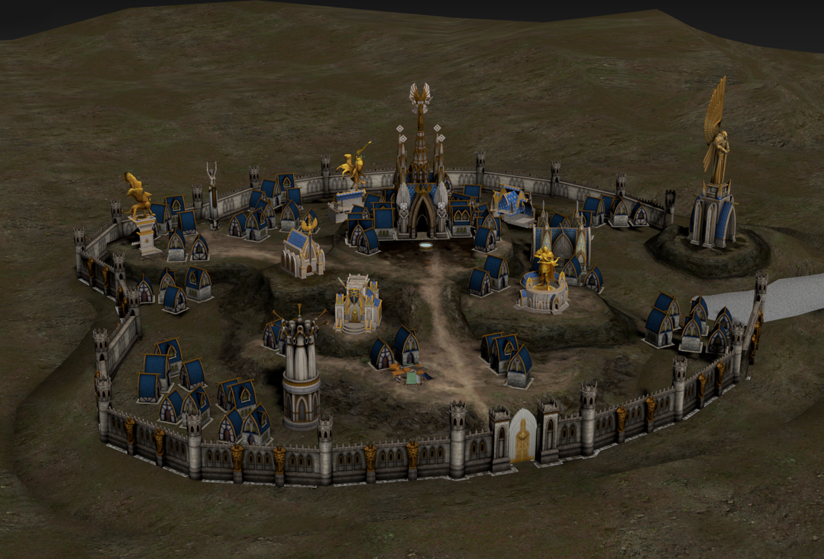 Сделан на основе интерьера города орков, большая часть зданий собрана из ассетов из шестёрки, некоторые здания взяты из might magic dynasty. Потом нужно будет покрасить землю под траву, добавить деревьев и каменные дороги, да и вцелом доработать модели и текстуры.