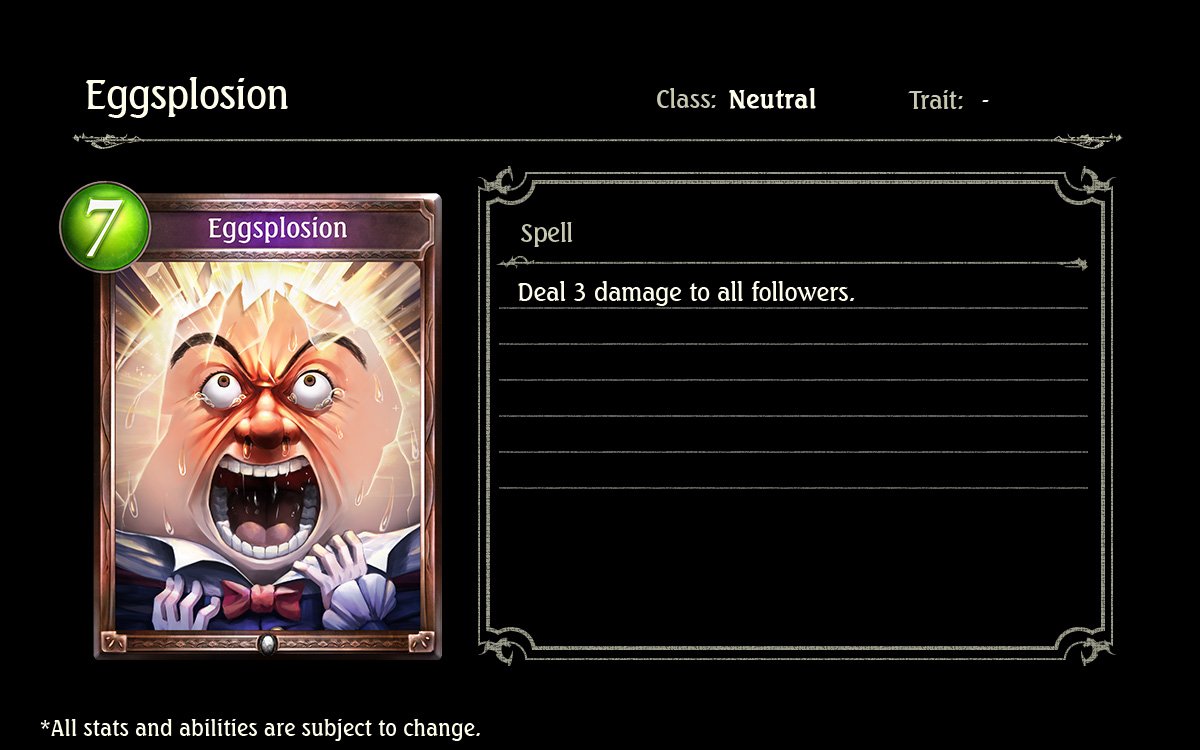 В офпереводе название ещё смешнее. Карта хорошая. Да-да, как АоЕшка она говно из говен, у хевена на 6 раунд есть охреневшая АоЕ, а тут жалкие 3 дамага. Но смарите. У леса не так уж и много 7-дропов, у меня сейчас только королева, а всякие дварфы-гигасы идут лесом в меме-тир (хотя в контрольной мете гигас не самое плохое, что может случиться с лесом, у меня он какое-то время был в деке в начале РоБ, просто зачем гонять средней паршивости юнита, если есть клёвые и очень клёвые). На 6 раунд все новые модные лесные парни захотят класть ББ. ББ плевать на дамаг от спеллок. ТЕНЬ, ГРЁБАНАЯ ТЕНЬ, КОТОРАЯ ВЕЧНО ХАРДКОНТРИТ ЛЕС, сильно-сильно боиццо, кастует ДБ и сидит за тремя 2/3 вардами. ДОПУСТИМ. Ну или тупо фигачит ГРЁБАНОГО ГЕКТОРА, зафлуживает стол зомбями и не трейдится в ББ (что очень странно, но ВДРУГ). Седьмой раунд - яйца инкаминг! Все зомбаки получают по я... хм... По заслугам, ББ плюёт на дамаг от спеллок и хреначит в рыло на 9 (если игра идёт по кривой, то для ББ на шестой раунд всегда будет эвольвик). Восьмой раунд - хей, летсплей, хей, летсплей, хей, летсплей, СКРИИИИИИИИИИИИИИИИИИИИИИ ИИИИИИИИИИИИИИИИИИИИ.