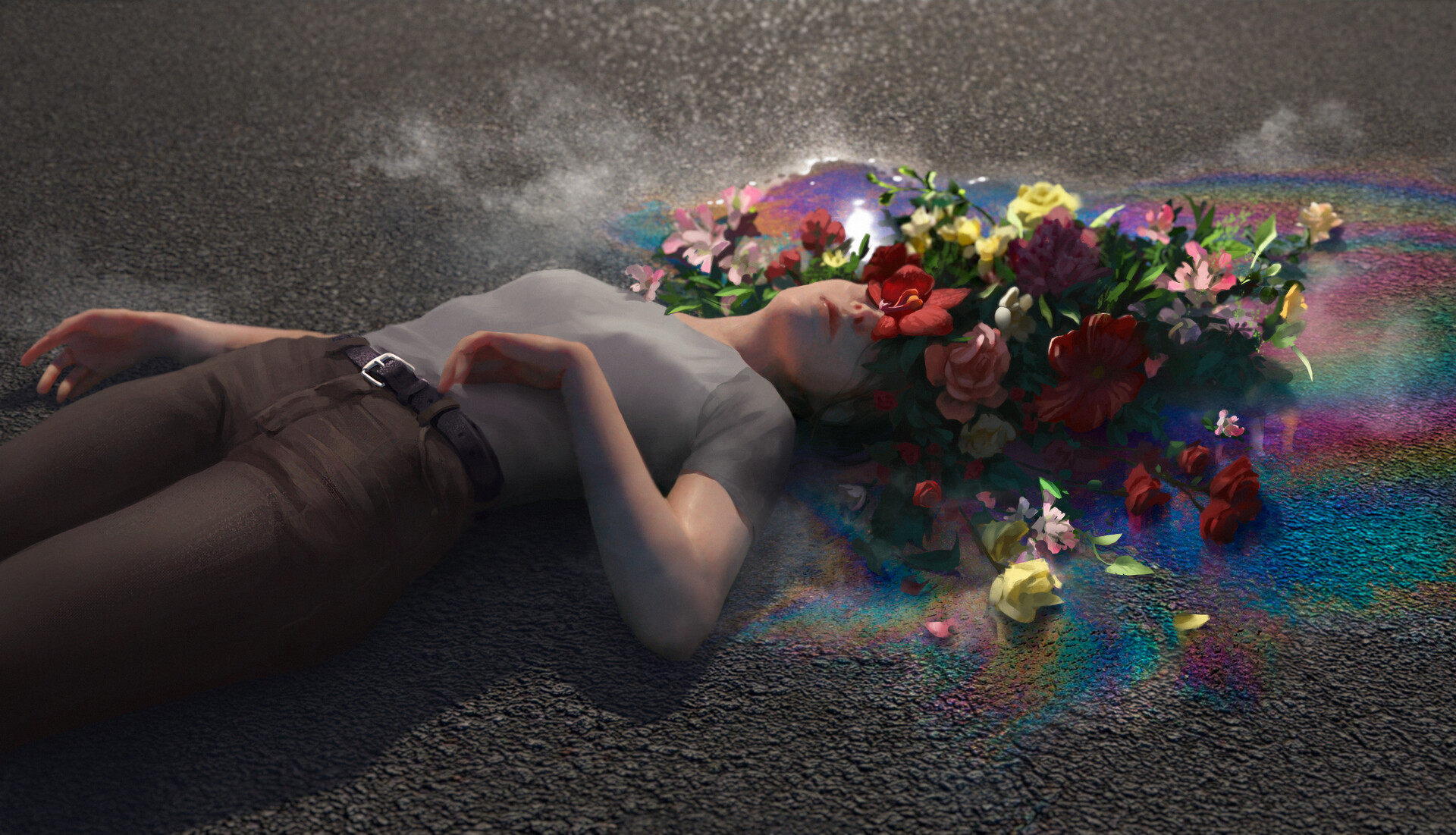 Да змей просто из-за плеча смотрит то же, что и девушка. Нашёл это забавным и рассмеялся, потому пасть открытая. А она терпеливо делает вид, что не замечает его и всё ждёт пока он, наконец, не уйдёт.