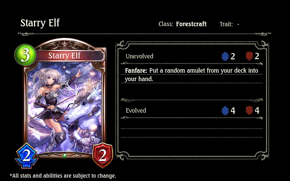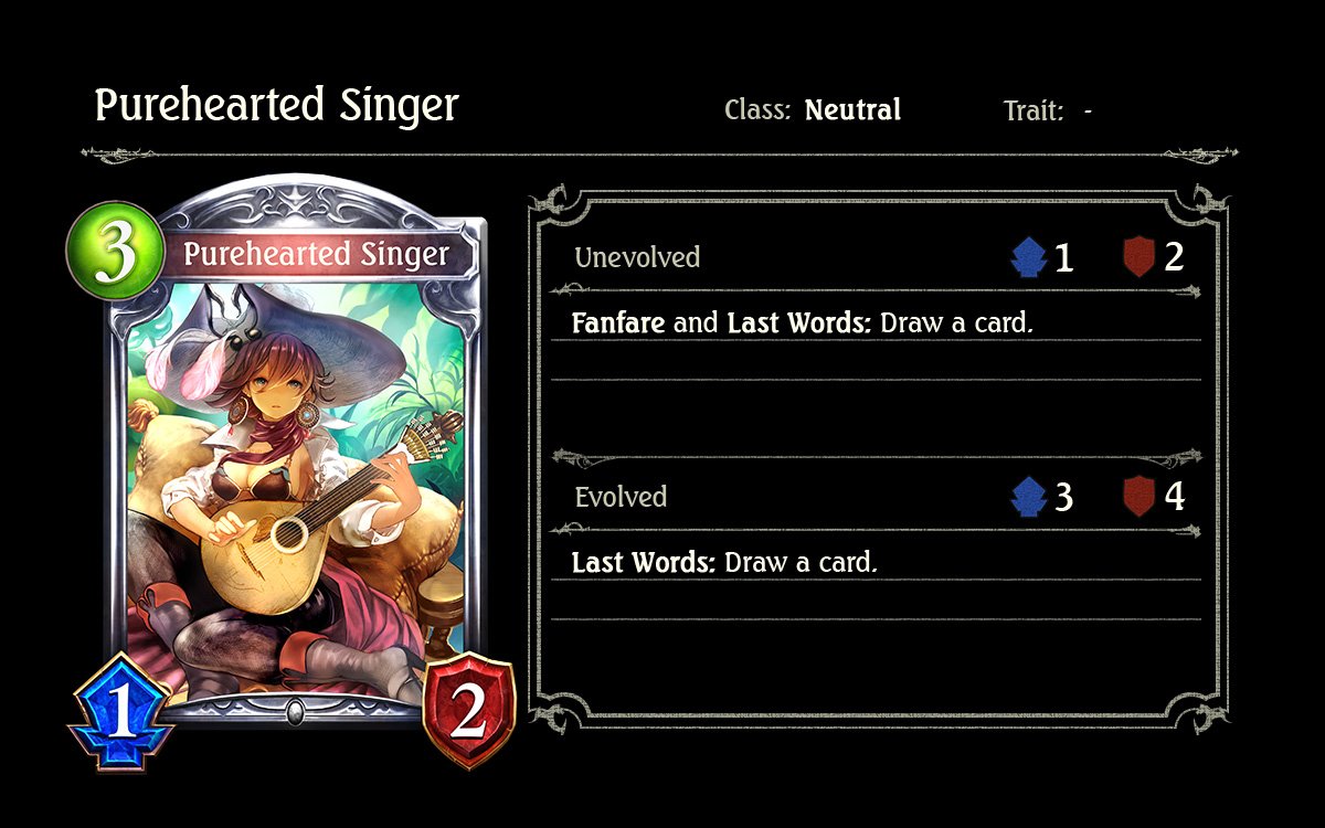 Forest gold amulet(1): Countdown(3). When this amulet returns to your hand draw 1 card. At the end of your turn, give +1/+0 to a random allied follower. Last word: draw 1 card.