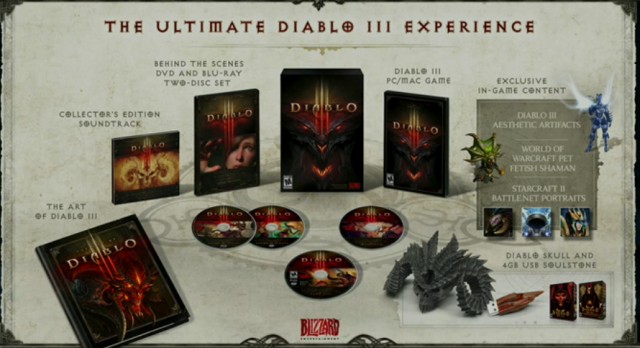 Blizzard анонсировали содержимое коллекционного издания Diablo 3, в него войдут: Полная версия Diablo 3. DVD с рассказами разработчиков о процессе создания игры. Диск с музыкой из игры. Альбом с игровым артом. Череп Диабло и USB-флешка на 4 гигабайта, выполненная в форме камня душ. (Череп одновременно является подставкой для флешки). Бонусы для других игр Близзард: питомец Fetish Shaman для World of Warcraft и набор портретов для Starcraft II.