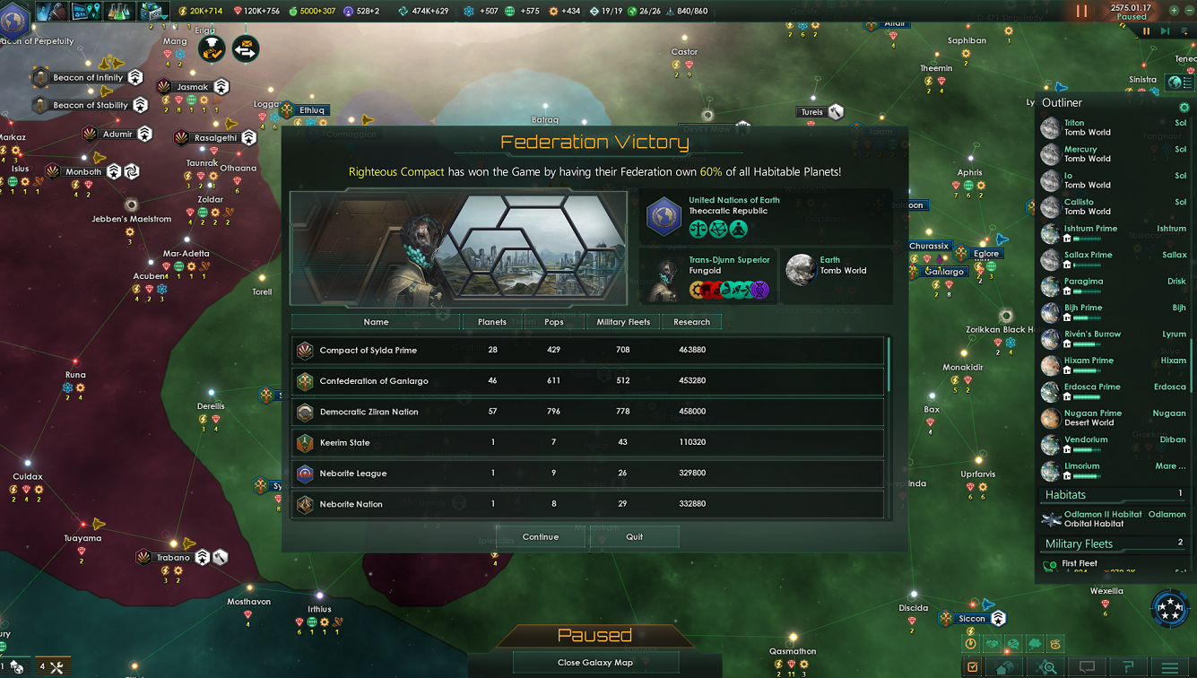 А ты и дальше трать влияние на покупку новых лидеров...Но какие бы не были дары этих божеств - разве этого мы хотели в начале нашего пути? Разве мы могли подумать, что стремление к истине приведёт нас к кошмару? Но истина есть истина, какой бы она не была. И чтобы постичь её полностью, до конца, нам оставался последний шаг. Мы отдали этим богам себя, население наших и некоторых чужих планет, мы отдали им свет нашей звезды и наши души.