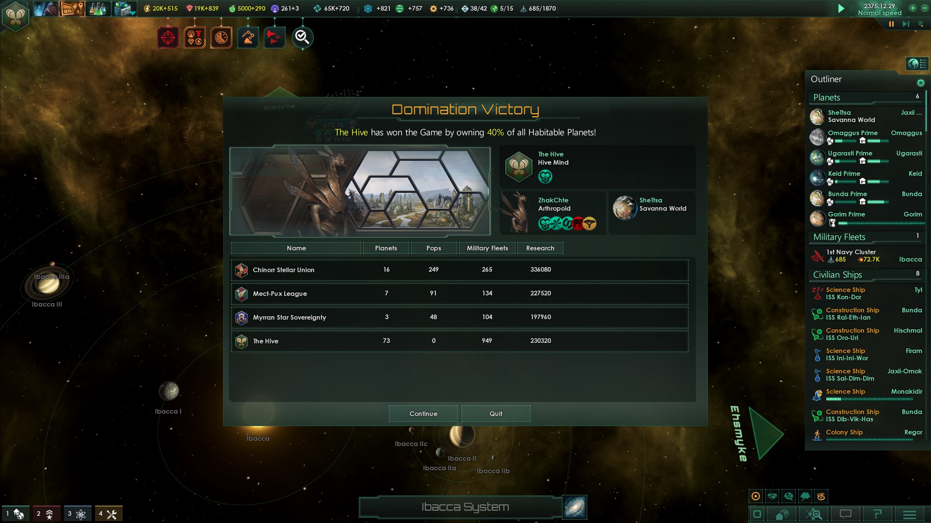 У меня с дипломатией ничего хорошего не получалось, хотя я особо и не пробовала, собственно. Обычно отношения с соседями такие, что они мне то границы закроют, то соперником объявят, то аще воевать полезут. Сейчас вот у меня на задворках империи какие-то лошки сидят, с ними можно было бы попробовать, но я хайвмайнд, ещё перебью их всех нечаянно, как каких-то лошков на одной колонизированной планете.