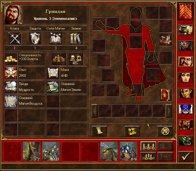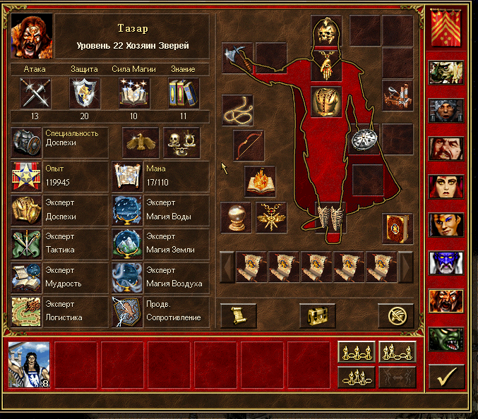 Веселая получилась игра . На респе не бло ничего кроме золота, это конечно неплохо, но не очень. странтовый герой с 15 бесами тоже не радовал. Затем в таверне появилась исра, и стало понятно, что единственный шанс в этой игре, это нанекрить скелетов. Была разведана конса 2-4. Вторичка была снежная, выход в верху, в общем не скоро был взят второй замок, но благо золота было достаточно и ифриты встали в ците на первой. Далее клавиус с 30 селетами в таверне. Пробиваю 8 грейженых единорогов в центральную зону, там конюшня и больше ничего хорошего, кроме золота конечно. В центре беру пару склепов, один макси и в нем неплохая накидка +3 к длительности заклов.На 131 пробиваю 60 грейженых демонов за пондорку, а там немудрому клавиусу вся магия земли Кстати, помог гошан, с 60 скелетами пришедший в таверну. Затем бегу наверх, беру консу и становлюсь перед телпортом на разгоне. На 137 беру замок опа, покупаю там наг и магов. Затем бегаю в арену за +2 атаки, потому чувтсвавалось, что понадобится. У противника светтся статы 9 10 16 13 против моих 8 6 3 4 думаю, что мне может помочь, не сильног ясно, бегу в свой замок наудачу. Тут опп нападает, но армии там почти нет: 9 уток 15 монахов 28 гномов.и ещё по мелочи