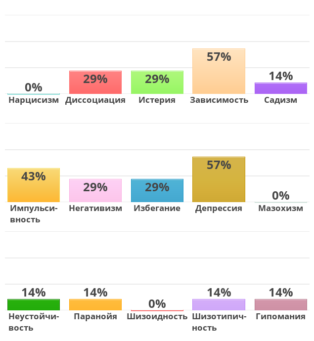 Какой-то с мрачным уклоном тест, как по мне. Прямой вопрос про суицид... Не ожидал, однако, мне казалось, что это исключительно редкая и скользкая тема. Да и в целом вопросы не очень, сами формулировки часто меня раздражали.